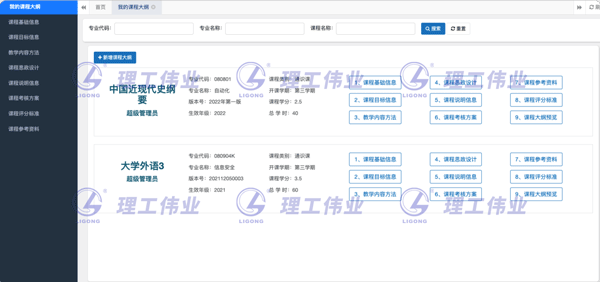 課程大綱管理模塊針對(duì)每一門課程,詳細(xì)的定義了課程的詳細(xì)內(nèi)容,包括基本信息,授課教師,教學(xué)目標(biāo),教學(xué)單元,教學(xué)方式,評(píng)價(jià)方式等等。