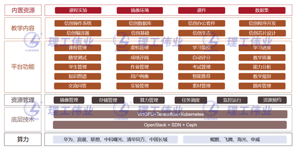 數(shù)智化實(shí)踐教學(xué)平臺(tái)采用國(guó)產(chǎn)化技術(shù),實(shí)現(xiàn)云計(jì)算資源的集中共享、統(tǒng)一調(diào)度管理的技術(shù)創(chuàng)新。在教學(xué)方式上,提供了一站式教學(xué)服務(wù),可滿足用戶備課、授課、課堂互動(dòng)、課后作業(yè)、課程考核、實(shí)訓(xùn)拓展、教學(xué)考試和教學(xué)分析全過(guò)程教學(xué),并且針對(duì)不同學(xué)習(xí)程度的用戶定制打造實(shí)驗(yàn)學(xué)習(xí)環(huán)境和課程體系,讓教學(xué)更簡(jiǎn)單,更高效。解決了傳統(tǒng)教育信息化架構(gòu)諸多難題,優(yōu)化教學(xué)模式,不僅讓教學(xué)功能得以滿足,更增加了輔助教學(xué)工作的實(shí)用功能,減輕了教師的負(fù)擔(dān),提升教學(xué)質(zhì)量。