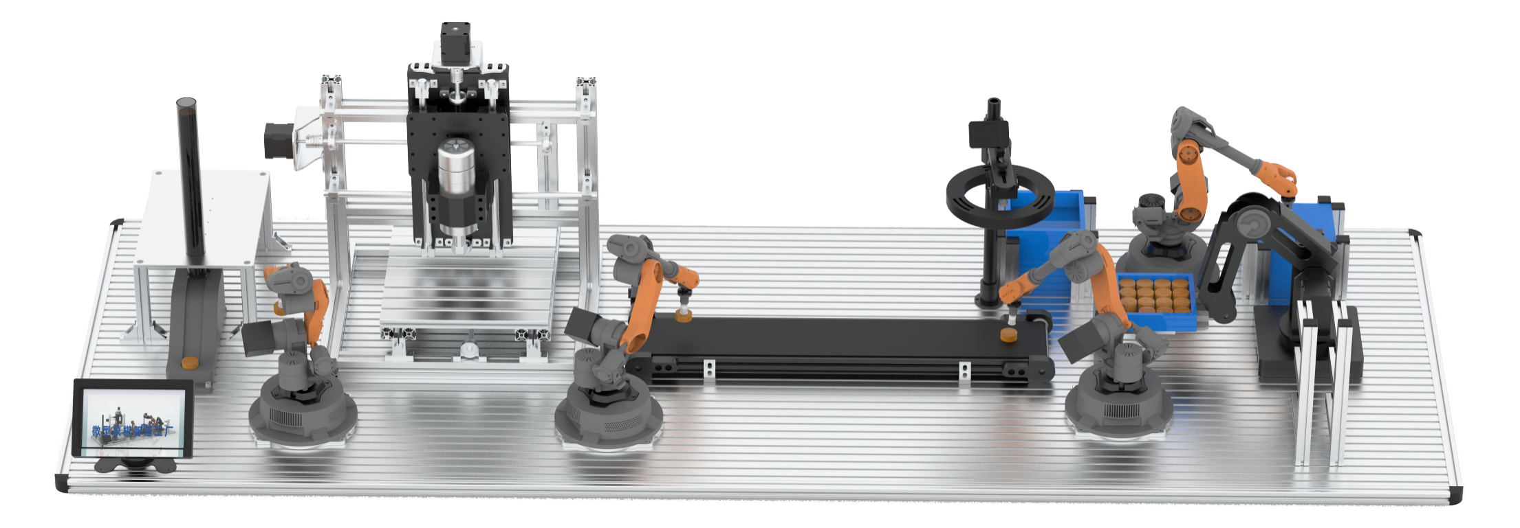 2、★產(chǎn)線包含由產(chǎn)線狀態(tài)顯示單元、電機(jī)驅(qū)動(dòng)的自動(dòng)化原料釋放單元,激光雕刻生產(chǎn)單元,傳送帶運(yùn)輸單元,視覺檢測單元、兩套六軸機(jī)械臂組成的成品單元及一套桌面碼垛機(jī)械臂組成的倉儲(chǔ)單元,產(chǎn)線急停按鈕及狀態(tài)指示燈。