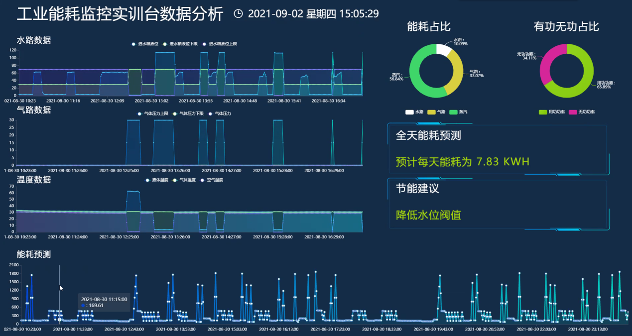 采用智能電流電壓表實時監(jiān)測總電源、氣循環(huán)控制系統(tǒng)、水循環(huán)控制系統(tǒng)運行消耗的電壓、電流、頻率、功率等,進(jìn)行電能采集分析。