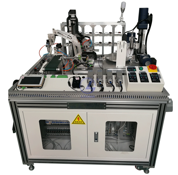 實(shí)訓(xùn)臺(tái)依托工業(yè)背景,具有較完整的模塊化產(chǎn)線,包括感知設(shè)備、執(zhí)行機(jī)構(gòu)、可編程邏輯控制器、HMI觸摸屏、工業(yè)網(wǎng)關(guān)、工業(yè)物聯(lián)網(wǎng)云平臺(tái)等,能夠開展絲桿滑臺(tái)直線運(yùn)動(dòng)控制、轉(zhuǎn)臺(tái)旋轉(zhuǎn)運(yùn)動(dòng)控制、機(jī)械手坐標(biāo)調(diào)試及多自由度運(yùn)動(dòng)控制、傳送帶控制及調(diào)速、工件到位檢測、氣缸分揀控制、機(jī)器視覺殘次品檢測、加工軸轉(zhuǎn)速溫度振動(dòng)多參數(shù)監(jiān)測、氣動(dòng)壓力檢測、工業(yè)設(shè)備狀態(tài)監(jiān)測數(shù)據(jù)上云、工件殘次品統(tǒng)計(jì)分析等工業(yè)控制應(yīng)用實(shí)訓(xùn)項(xiàng)目,為相關(guān)專業(yè)升級(jí)和改革提供教學(xué)、實(shí)驗(yàn)和科研支撐。產(chǎn)品外觀如圖所示。