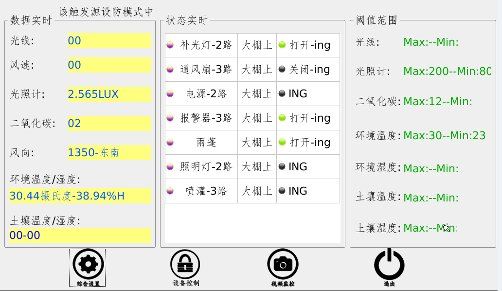 具有傳感器與執(zhí)行器的聯(lián)動設(shè)置功能。設(shè)置傳感器的上、下限值,以及當(dāng)傳感器采樣低至下限或高至上限時,執(zhí)行器的動作,可實現(xiàn):(1)大棚內(nèi)溫度自動調(diào)節(jié)功能,(2)大棚濕度自動調(diào)節(jié)功能,(3)土壤濕度自動調(diào)節(jié)功能,(4)光照強(qiáng)度自動調(diào)節(jié),(5)大棚CO2濃度自動調(diào)節(jié)等功能。