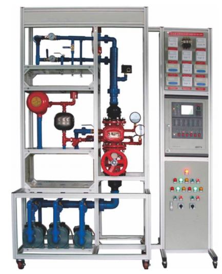 本裝置采用高級(jí)鋁型材框架開放式結(jié)構(gòu)設(shè)計(jì),主要由濕式報(bào)警閥、信號(hào)閘閥、水力警鈴、水延遲器、各類噴淋頭、增壓泵、恒壓泵、壓力開關(guān)、水流指示器、壓力表、末端試水裝置、透明有機(jī)玻璃水箱、水泵控制箱、火災(zāi)報(bào)警控制器、聯(lián)動(dòng)控制模塊、基于BACnet總線網(wǎng)絡(luò)的DDC控制器、手閥及各類水管等組成。