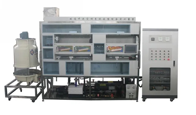 實(shí)訓(xùn)對象平臺采用不銹鋼架制成,系統(tǒng)由制冷機(jī)組、冷卻水系統(tǒng)、冷凍水系統(tǒng)、集中式中央空調(diào)系統(tǒng),半集中式中央空調(diào)系統(tǒng)等組成。