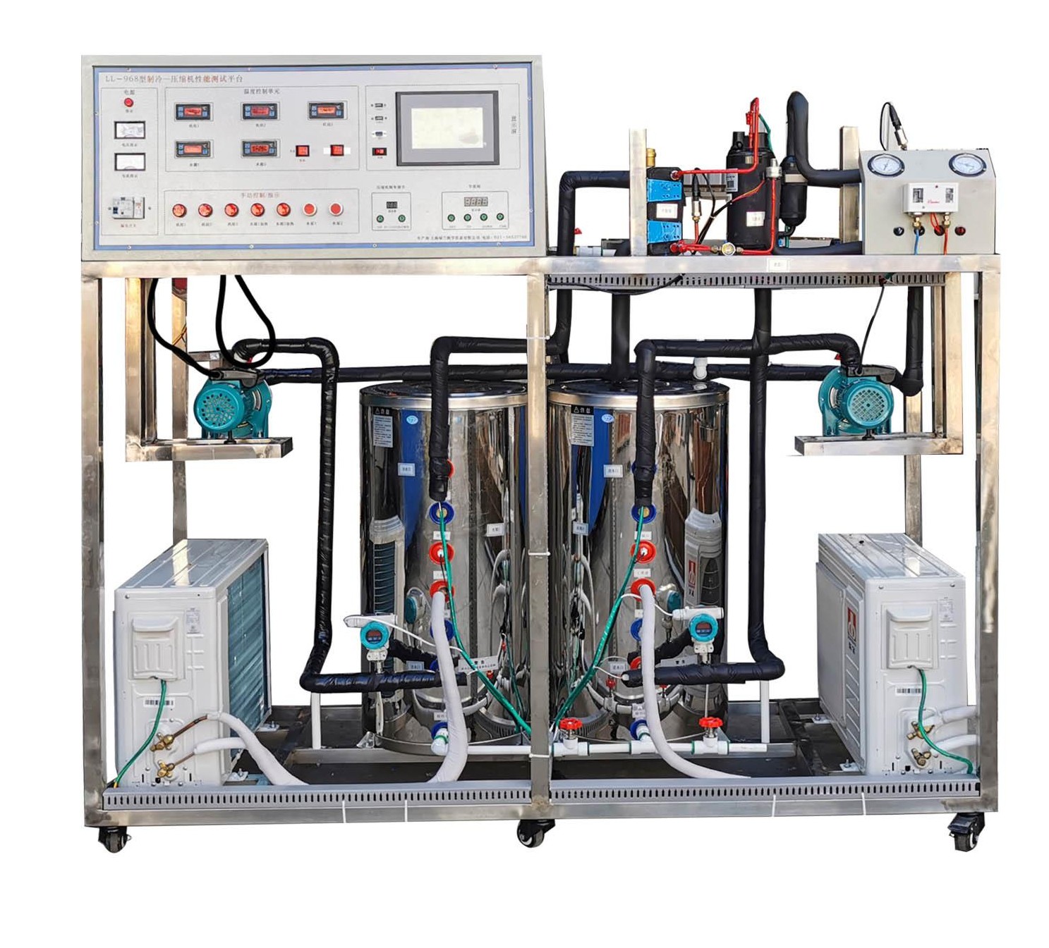 TYK-RB01型 熱泵-壓縮機(jī)性能實驗系統(tǒng)采用熱平衡法測量熱泵與制冷壓縮機(jī)的性能。系統(tǒng)主要由制冷壓縮機(jī)、蒸發(fā)器、冷凝器、恒溫水箱和電子膨脹閥等組成。采用傳感器和檢測儀表采集蒸汽壓縮式制冷循環(huán)過程中的溫度、壓力、流量、壓縮機(jī)功率、電流、頻率等狀態(tài)參數(shù),經(jīng)自行研制的數(shù)據(jù)采集板卡連接到計算機(jī),基于面向?qū)ο蠹夹g(shù)開發(fā)的具有實時性高,界面設(shè)計人性化等特點的測控軟件實現(xiàn)熱力循環(huán)過程實時動態(tài)顯示、性能參數(shù)測試和計算,構(gòu)成具有檢測、分析、記錄、測試、繪圖等多功能一體化的熱泵-壓縮機(jī)性能實驗系統(tǒng)。基于基礎(chǔ)型機(jī)組,增加如下內(nèi)容:學(xué)生設(shè)計型與創(chuàng)新型實驗。