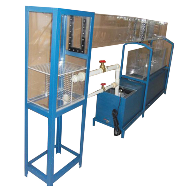水泵、實驗水槽、蓄水箱、消能池、整流柵板、三角堰、寬頂堰、實用剖面堰、閘板、流量計、水位測針、量角器、刻度標尺、水準器、升降機、實驗管道、閥門、自循環(huán)裝置、不銹鋼框架及電控柜。