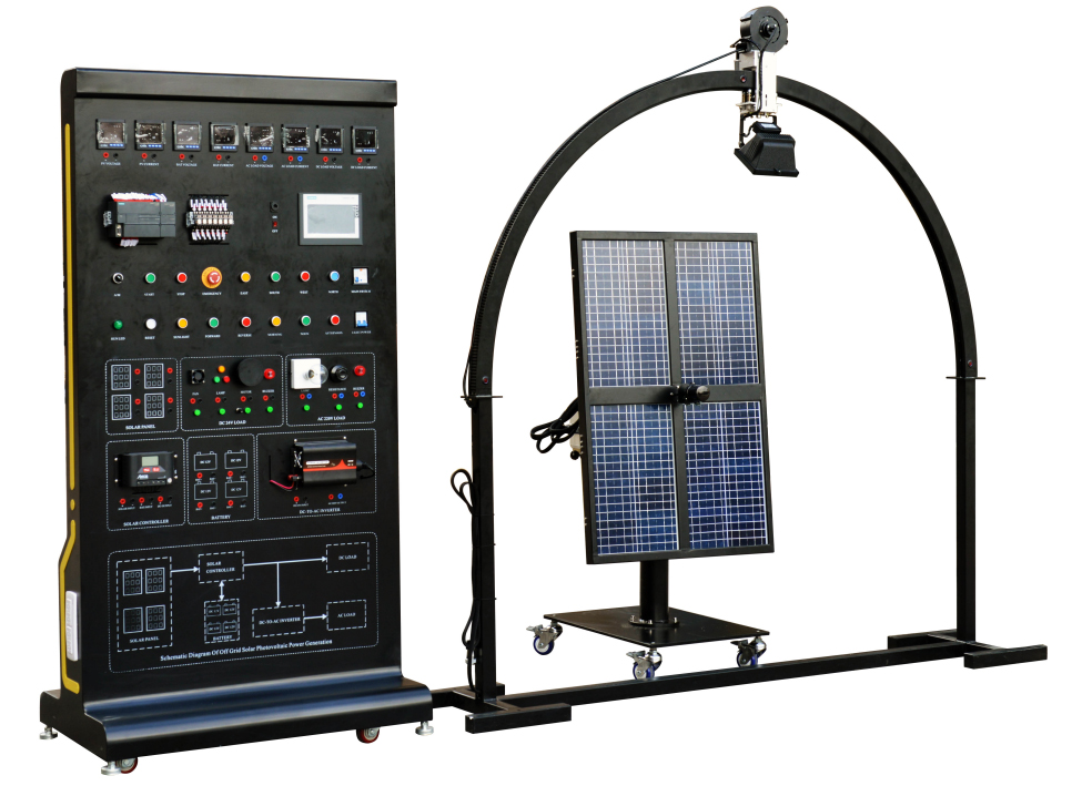 傳統(tǒng)的太陽能發(fā)電技術主要為太陽能電池板以固定的角度安放在地面上,這樣使太陽能電池板的轉換效率大大的降低。而我們根據(jù)太陽運動軌跡應用PLC控制系統(tǒng)、光學傳感器和直流電機系統(tǒng)實現(xiàn)了太陽能電池板的追日。使太陽能電池板始終與太陽入射光線成90°夾角,實現(xiàn)太陽能電池板的效率最大化。為了使學生能充分的學習新技術、了解當前新能源科技的發(fā)展前沿。我公司結合當前太陽能發(fā)展情況和未來的發(fā)展方向研制出了新型的太陽能發(fā)電設備:太陽能光伏發(fā)電綜合實訓系統(tǒng)。