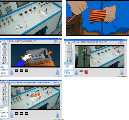 ? ? ? “煤礦特殊工種可視化實(shí)操模擬演示系統(tǒng)”學(xué)習(xí)模塊包括煤礦安全理論知識(shí)、安全基礎(chǔ)技術(shù)知識(shí)、生產(chǎn)專(zhuān)業(yè)技術(shù)知識(shí)、生產(chǎn)專(zhuān)業(yè)技能操作、自救互救與創(chuàng)傷急救等內(nèi)容。素材庫(kù)綜合利用文字解說(shuō)、圖形圖像、影音視頻、二三維動(dòng)畫(huà)、虛擬仿真等多種形式,把煤礦一般從業(yè)人員、特種作業(yè)人員、煤礦主要負(fù)責(zé)人及生產(chǎn)管理人員等相關(guān)內(nèi)容,通過(guò)圖文并茂、視聽(tīng)結(jié)合、虛擬互動(dòng)的方式,將復(fù)雜枯燥的知識(shí)點(diǎn)通俗生動(dòng)的表現(xiàn)出來(lái)。使學(xué)習(xí)內(nèi)容有形有聲有色,具有很強(qiáng)的直觀(guān)性。