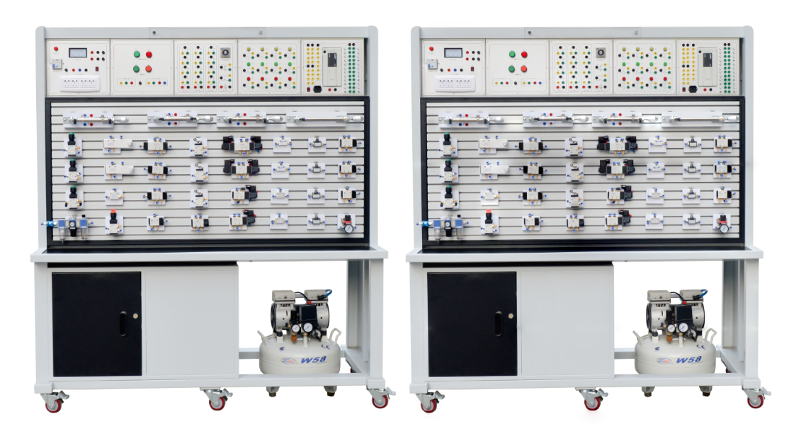 本實訓裝備,由實訓臺桌、氣動系統(tǒng)回路實訓操作面板部分、電氣控制部分等組成,電氣部分主要由PLC模塊、繼電器模塊、電源模塊、按鈕模塊等部分組成。實訓臺主體框架采用鋁木結構組裝完成,臺架重量較輕且安裝了萬向輪,可方便實訓臺的移動。臺架分上下兩層結構,上面可放置電氣模塊,下面是實訓屏,實訓屏采用帶槽鋁合金結構,方便各氣動元件的安裝和拆卸,學生可以根據實驗需要在實訓屏上任意搭建氣動回路,組成具有一定功能的氣動系統(tǒng)。實訓臺采用模塊式結構,便于組合與擴展,提高了設備空間的利用率,并采用二合一的雙面實訓操作面板,更加有效的合理的利用實訓空間。