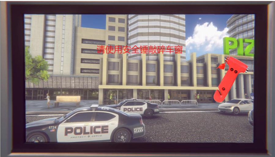 軟件內容:模擬一段城市背景道路,有公交車站臺,大小車輛,車輛交匯,行人等,模擬公交車在街道上行駛,在路口轉彎時配有語音提示“車輛轉彎,請扶好扶手”,車廂內搭載視頻(播報公交車相關逃生畫面)播放完畢后若干秒,前方道路出現(xiàn)模擬油罐車迎面相撞,(伴隨車身較強撞擊感抖動),隨后畫面內油罐車體側翻著火。然后,模擬車廂著火后,車內講解引導逃生流程,駕駛員應開啟車門,令乘客從車門下車。然后,模擬汽車車廂著火,駕駛員打開車門,讓乘客從兩頭車門有秩序地下車。乘客們可用衣物蒙住頭部,從車門沖下。模擬車門被火燒壞,開啟不了,乘客在則面一塊屏上模擬操作安全錘擊打車窗的模擬操作。車窗有模擬碎裂感(視頻特效),乘客模擬砸開側面車窗逃生。體驗了上述驚險過程,掌握逃生技巧,了解逃生知識,當火災發(fā)生時要冷靜處理,科學逃生。