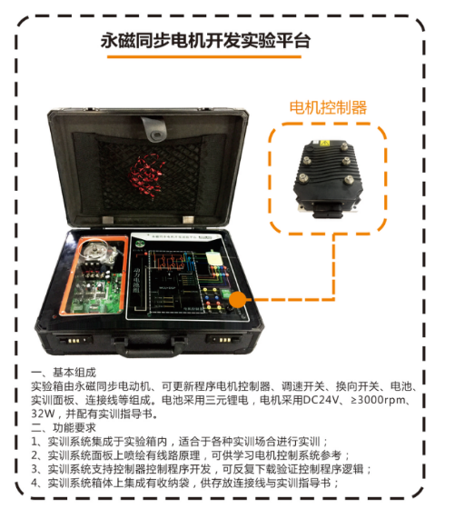 ?實(shí)驗箱由永磁同步電動機(jī)、可更新程序電機(jī)控制器、調(diào)速開關(guān)、換向開關(guān)、電池、實(shí)訓(xùn)面板、連接線等組成。電池采用三元鋰電,電機(jī)采用DC24V、≥3000rpm、32W。