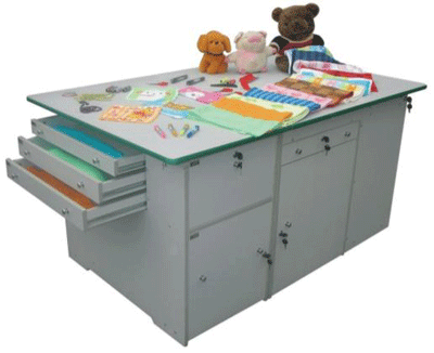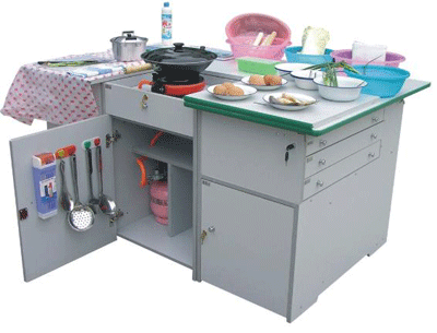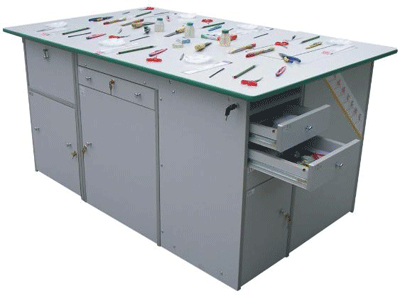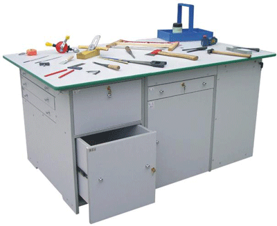 功能:桌體材料選用16mm厚優(yōu)質(zhì)雙貼面三聚氰胺板和30mm×30mm角鋼組成,桌體板截面選用優(yōu)質(zhì)PVC封邊經(jīng)全自動(dòng)封邊機(jī)加溫180攝氏度膠封。桌面材料選用(A型)18mm厚優(yōu)質(zhì)雙貼面三聚氰胺板或(B型)25mm后成型防火貼面密度板,桌面板截面選用綠色T型PVC封邊槽封。桌體設(shè)計(jì)由三獨(dú)立單元組合在一起,例如金工、木工、洗滌為A獨(dú)立單元,烹飪、電工與電子為B獨(dú)立單元,縫紉與裁剪、手工工藝為C獨(dú)立單元。如果A獨(dú)立單元或B獨(dú)立單元單獨(dú)操作時(shí),桌面可翻轉(zhuǎn)自如,而且各獨(dú)立單元的配備都儲(chǔ)放在各自獨(dú)立單元桌體里面。